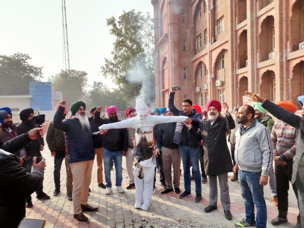 ਅੰਮ੍ਰਿਤਸਰ 17 ਦਸੰਬਰ ( ਰਾਜਿੰਦਰ ਧਾਨਿਕ ) : ਪੰਜਾਬ ਸਟੇਟ ਮਨਿਸਟੀਰੀਅਲ ਸਰਵਿਸਜ਼ ਯੂਨੀਅਨ ਸੂਬਾ ਕਮੇਟੀ ਵੱਲੋ ਲਏ ਫੈਸਲੇ ਤਹਿਤ ਮਨਿਸਟੀਰੀਅਲ ਕਾਮਿਆਂ ਦੀਆਂ ਹੱਕੀ ਅਤੇ ਜਾਇਜ ਮੰਗਾਂ ਦੀ ਪ੍ਰਾਪਤੀ ਲਈ ਜਿਲ੍ਹਾ ਇਕਾਈ ਅੰਮ੍ਰਿਤਸਰ ਵੱਲੋਂ ਮਨਜਿੰਦਰ ਸਿੰਘ ਸੰਧੂ ਜਿਲਾ ਪ੍ਰਧਾਨ ਅਤੇ ਜਗਦੀਸ਼ ਠਾਕੁਰ ਜਿਲਾ ਜਨਰਲ ਸਕੱਤਰ , ਮਨਦੀਪ ਸਿੰਘ ਚੌਹਾਨ ਜਿਲਾ ਵਿੱਤ ਸਕੱਤਰ, ਤਜਿੰਦਰ ਸਿੰਘ ਢਿੱਲੋਂ ਜਿਲਾ ਮੁੱਖ ਬੁਲਾਰਾ, ਅਸਨੀਲ ਸ਼ਰਮਾ ਜਿਲਾ ਮੁੱਖ ਸਲਾਹਕਾਰ, ਗੁਰਵੇਲ ਸਿੰਘ ਸੇਖੋਂ ਐਡੀਸ਼ਨਲ ਜਨਰਲ ਸਕੱਤਰ, ਅਮਨ ਥਰੀਏਵਾਲ,ਅਮਨਦੀਪ ਸਿੰਘ ਸੇਖੋਂ, ਅਤੇ ਮੁਨੀਸ਼ ਕੁਮਾਰ ਸੂਦ ਸੀਨੀਅਰ ਮੀਤ ਪ੍ਰਧਾਨ ਦੀ ਅਗਵਾਈ ਹੇਠ ਮਿਤੀ 17/12/2021 ਨੂੰ ਡਿਪਟੀ ਕਮਿਸ਼ਨਰ ਦਫਤਰ ਅੰਮ੍ਰਿਤਸਰ ਦੇ ਬਾਹਰ ਰੋਸ ਰੈਲੀ ਕਰਕੇ ਪੰਜਾਬ ਸਰਕਾਰ ਦਾ ਪੁਤਲਾ ਫੂਕਿਆ ਗਿਆ।