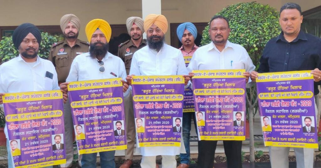 अमृतसर 8 नवंबर (पवित्र जोत) : केंद्र और पंजाब सरकार की तरफ से बेटियों के हक में ‘बेटी बचाओ,बेटी पढ़ाओ’ मुहिम को आगे ले जाते प्रसिद्ध खेल संस्था सरहद -ऐ -पंजाब स्पोर्टस क्लब (र) और की तरफ से मान बेटियाँ और समाज भलाई सोसायटी अमृतसर के सहयोग के साथ “बेटी खिलाओ’ का नारे के साथ ज़िला कांग्रेस समिति ( देहाती) अमृतसर के प्रधान भगवंतपाल सिंह सच्चर ने “पहले कबड्डी गोल्ड कप -2020 (लड़कियों) का पोस्टर रिलीज करते कहा कि उपरोक्त संस्था के प्रधान गुरिन्दर सिंह मट्टू (प्रसिद्ध समाज सेवक) के कामों की प्रशंसा करते बेटियाँ को पढ़ाई के साथ साथ खेल की तरफ भी प्रेरित करने के लिए कहा l प्रधान मट्टू ने जानकारी देते कही 21 नवंबर शनिवार को कोट खालसा में होने वाले पहले कबड्डी गोल्ड कप (लड़कियों) में खालसा सेवा धर्म प्रचार जत्था चक्रवर्ती बार्डर अजनाला की लड़कियों का गतका के इलावा रवायती खेल में कानों के साथ मोटरसाईकल खीचना, भार खीचना, और अंगहीनों की खेल भी करवाया जाएंगी। इस मौके ज़िला कांग्रेस समिति ( देहाती) अमृतसर के प्रधान भगवंतपाल सिंह सच्चर, प्रधान गुरिन्दर सिंह मट्टू,बलजिन्दर सिंह मट्टू,शिव सिंह और कुलविन्दर सिंह मौजूद थे l