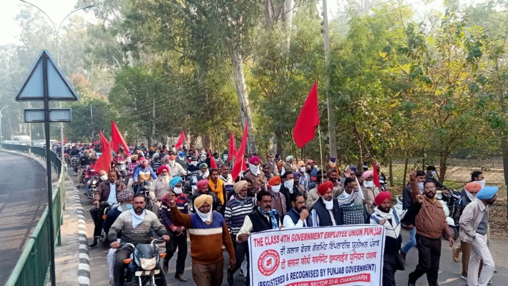 अमृतसर 3 दिसंबर (राजिंदर धानिक) : दी क्लास फोरथ एंपलाईज़ यूनियन पंजाब की तरफ से झंडा मार्च के एक्शन की कड़ी में सरकारी और अर्ध सरकारी विभागों के चौथा दर्जा, आउट सोर्स, कंट्रैक्ट, डेलीवेज,पार्टी टाईम, कर्मचारियों को रेगुलर कराने सहित मुलाज़ीम की ओर माँगों को लेकर ज़िला प्रशास्निक कंपलैक्स में रैली करके सिंचाई विभाग के भाखड़ा मैन लाईन के दफ़्तर तक झंडा मार्च किया गया। जहाँ इस विभाग के पुनर्गठन को रिव्यू करके मुलाजिमों की छंटनी ना करने की माँग की गई। आगे वाली रैली 8/12 /2020 को आई.बी. सर्किल और 18 /12 /2020 को नगर निगम से शुरू करके स्थानिक सरकारा मंत्री के घर तक रोश मार्च किया जायेगा। आज के धरने का नेतृत्व दर्शन सिंह लूबाना राज्य प्रधान, जगमोहन सिंह, नौलक्खा ने की।