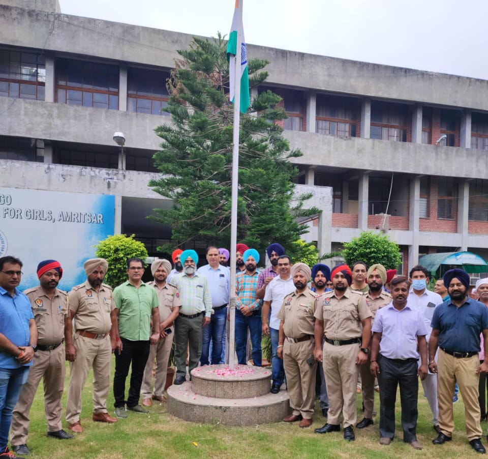 - ਅੰਮ੍ਰਿਤਸਰ,16 ਅਗਸਤ (ਰਾਜਿੰਦਰ ਧਾਨਿਕ)- ਮਾਈ ਭਾਗੋ ਸਰਕਾਰੀ ਬਹੁਤਕਨੀਕੀ ਕਾਲਜ ਲੜਕੀਆਂ ਅੰਮ੍ਰਿਤਸਰ ਵਿਖੇ ਸੰਸਥਾ ਦੇ ਮੁਖੀ ਦਵਿੰਦਰ ਸਿੰਘ ਭੱਟੀ ਵੱਲੋਂ ਆਜ਼ਾਦੀ ਦੀ 75ਵੀਂ ਵਰ੍ਹੇਗੰਢ ਤੇ ਤਿੰਰਗਾ ਲਹਿਰਾਉਣ ਦੀ ਰਸਮ ਅਦਾ ਕੀਤੀ ਗਈ। ਉਹਨਾਂ ਵੱਲੋਂ ਹਰ ਇੱਕ ਸਟਾਫ਼ ਮੈਂਬਰ ਨੂੰ ਤਿਰੰਗਾ ਦਿੰਦਿਆਂ ਆਪਣੇ-ਆਪਣੇ ਘਰਾਂ ਦੀ ਛਤਾਂ ਤੇ ਲਹਿਰਾਉਣ ਅਤੇ ਸੈਲਫੀ ਲੈ ਕੇ ਭਾਰਤ ਸਰਕਾਰ ਦੀ ਵੈੱਬਸਾਈਟ ਤੇ ਅਪਲੋਡ ਕਰਨ ਲਈ ਕਿਹਾ। ਮਜੀਠਾ ਰੋਡ ਬਾਈ-ਪਾਸ ਪੁਲਿਸ ਚੌਂਕੀ ਦੇ ਇੰਚਾਰਜ ਏ.ਐਸ,ਆਈ ਅਮਰ ਸਿੰਘ,ਏ. ਐਸ.ਆਈ ਮੰਗਮਲਕੀਤ ਸਿੰਘ,ਏ.ਐਸ.ਆਈ ਸ਼ਤੀਸ਼ ਕੁਮਾਰ,ਹਵਲਦਾਰ ਜਗਦੀਪ ਸਿੰਘ,ਕੁਲਦੀਪ ਸਿੰਘ ਵੱਲੋਂ ਸਲਾਮੀ ਦਿੱਤੀ ਗਈ।